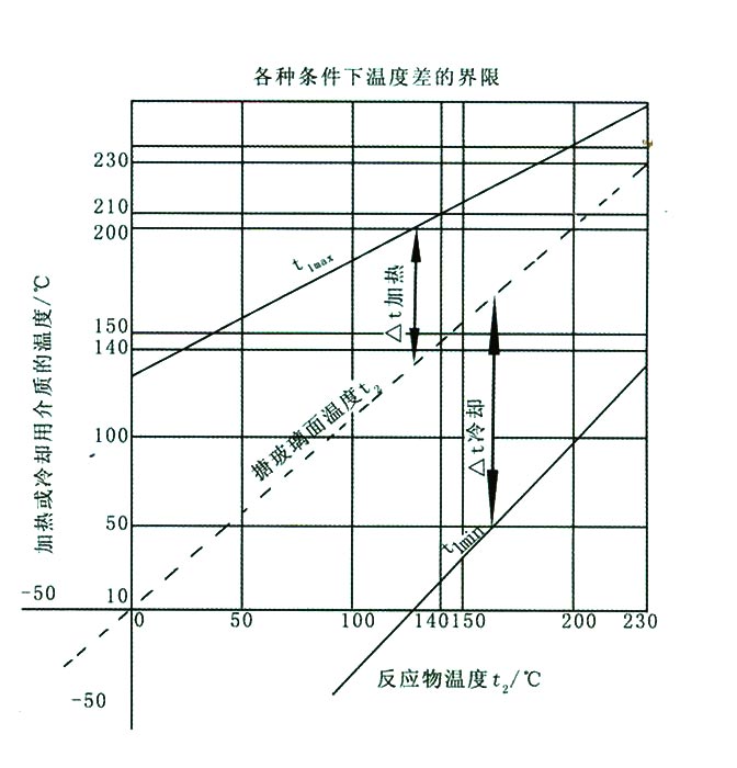 搪玻璃容器耐熱沖擊性能如圖所示,搪玻璃容器加熱時(shí)的最大溫差為△tmax=t1max - t2, 冷卻時(shí)最大溫差為△tmax=t2 - tlmin。由圖可知,當(dāng) 介質(zhì)溫度t?為140°C時(shí),夾套內(nèi)加熱蒸汽不能超過(guò)210°C,冷卻時(shí),介質(zhì)溫度不能低于20°C。